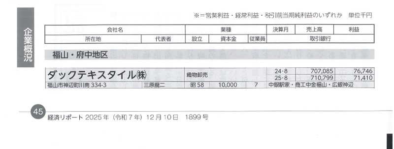 売上高は繊維部門が4.3%ダウン、不動産部門が4.6%アップで全体では0.5%の微増収でした。